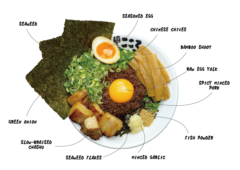 Kokoro's MAZESOBA is a type of noodle dish that can be made with a wide variety of ingredients and endless arrangements. Unlike aburasoba, mazesoba is served by mixing the ingredients and extra-thick glutinous noodles thoroughly.